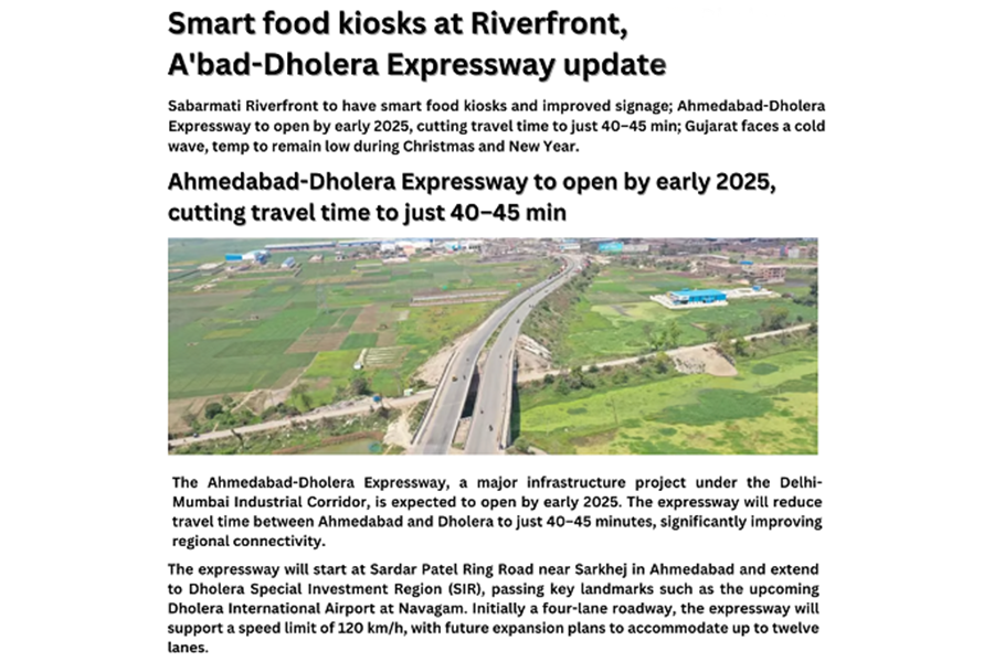 Sabarmati Riverfront to have smart food kiosks and improved signage; Ahmedabad-Dholera Expressway to open by early 2025, cutting travel time to just 40–45 min; Gujarat faces a cold wave, temp to remain low during Christmas and New Year; and more. Find out what’s happening in the city with this Ahmedabad News Roundup.